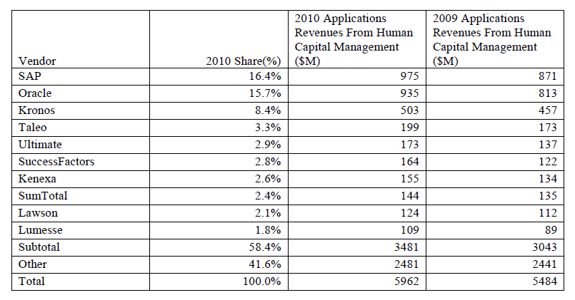 The following table lists the 2010 shares of the top 10 applications vendors in the Human Capital Management(HCM) market and their 2009 to 2010 applications revenues(license, maintenance and subscription) from the market.