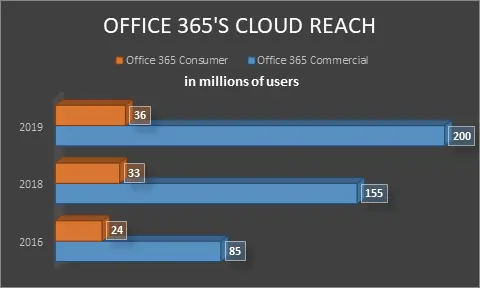 Microsoft’s outlook looks favorable. If one simply compares the fiscal year revenues of Microsoft and Salesforce, the delta between the two widens, resulting in a 23% advantage for the former. That does not even take into account the Cloud Applications revenues from its Office 365 Consumer product, which derives revenues from small businesses as well as individuals. In October 2019, Microsoft announced that Office 365 Commercial now has more than 200 million monthly active users and Office 365 Consumer has 36 million, compared with 155 million and 33 million a year ago, respectively. In 2016, Microsoft had 85 million subscribers for Office 365 Commercial and 24 million subscribers for Office 365 Consumer.